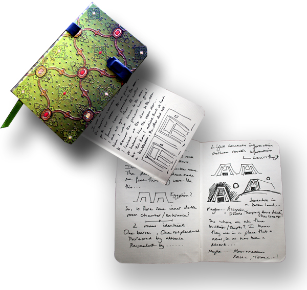 I had allowed two small groups to excavate on the “site”. One group had found a book outside. It was bound and clad in some dull silver metal. The design on the covering was tooled. It was designed in quarters. Each quarters displayed a design of magical symbols/sigils. Each quarters symbols were from a different culture, three quarters were from Egypt, Celtic and Sumerian the fourth quarter displayed symbols from somewhere I did not know…they appeared “Alien” other worldly. The book was very old.