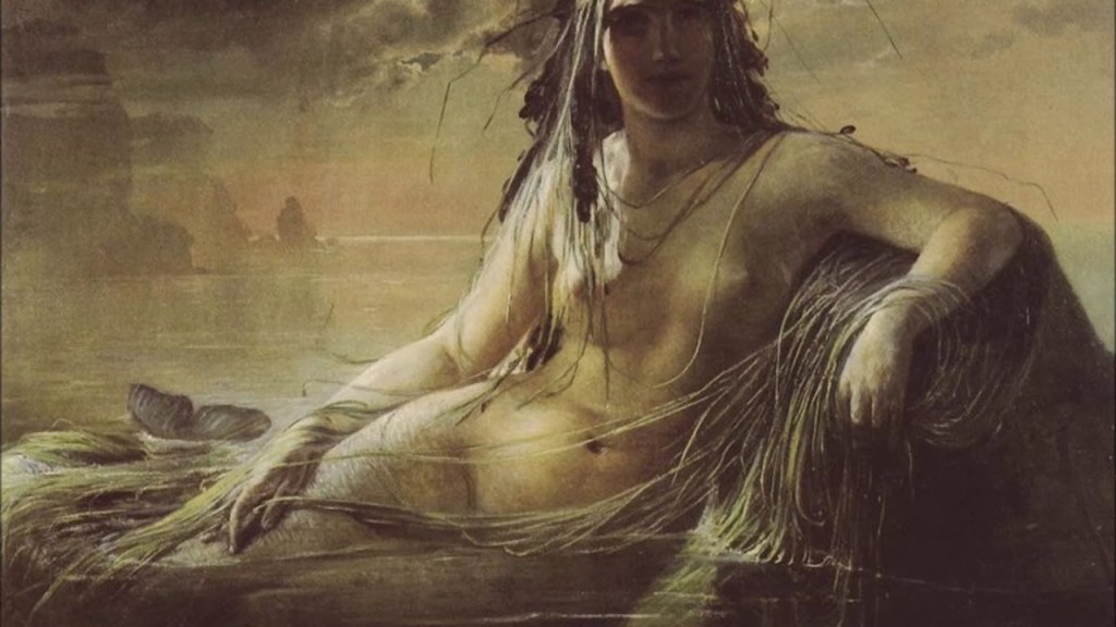 Achelous was father to the Sirens, deadly temptresses of the ocean who are often presented as synonymous with mermaids. In several European languages, including French, Italian and Spanish, the word for “mermaid” is actually a derivative of “siren”, while manatees and dugongs, those sea-mammals so often presented as the reality behind mermaid sightings, belong to the order Sirenia. However, the classical Sirens (whose number, names and maternal parent vary in different accounts) weren’t really fish-women. Their best-known appearance is in the Odyssey, where Odysseus is warned that once heard, their seductive song will cause his sailors to leap overboard and drown. The sailors manage to row on unharmed because they stop their ears with wax while Odysseus (Roman Ulysses) has himself bound to the mast and so hears the music without risking a watery grave. Homer’s description of the Sirens only says that they inhabit a flowery meadow surrounded by the remains of their victims, but the setting and the beautiful voices don’t immediately suggest fishy qualities. On Greek vases or Roman murals they appear as bird-women, sometimes just with human heads, sometimes human to the waist so that they have arms with which to play musical instruments. [3] They are sometimes described as the companions of Persephone, daughter of the earth goddess Demeter, who was carried off by Hades to be queen of the underworld. The Sirens either asked for wings so as to search for her or were cursed with them for not searching hard enough. They have another, more mysterious role, though, as mourning figures on Greek tombs. The so-called Harpy tomb from Xanthos, now in the British Museum, shows bird-bodied Sirens carrying off what appear to be little soul-figures, possibly fulfilling a role that popular Christian tradition later assigned to angels.